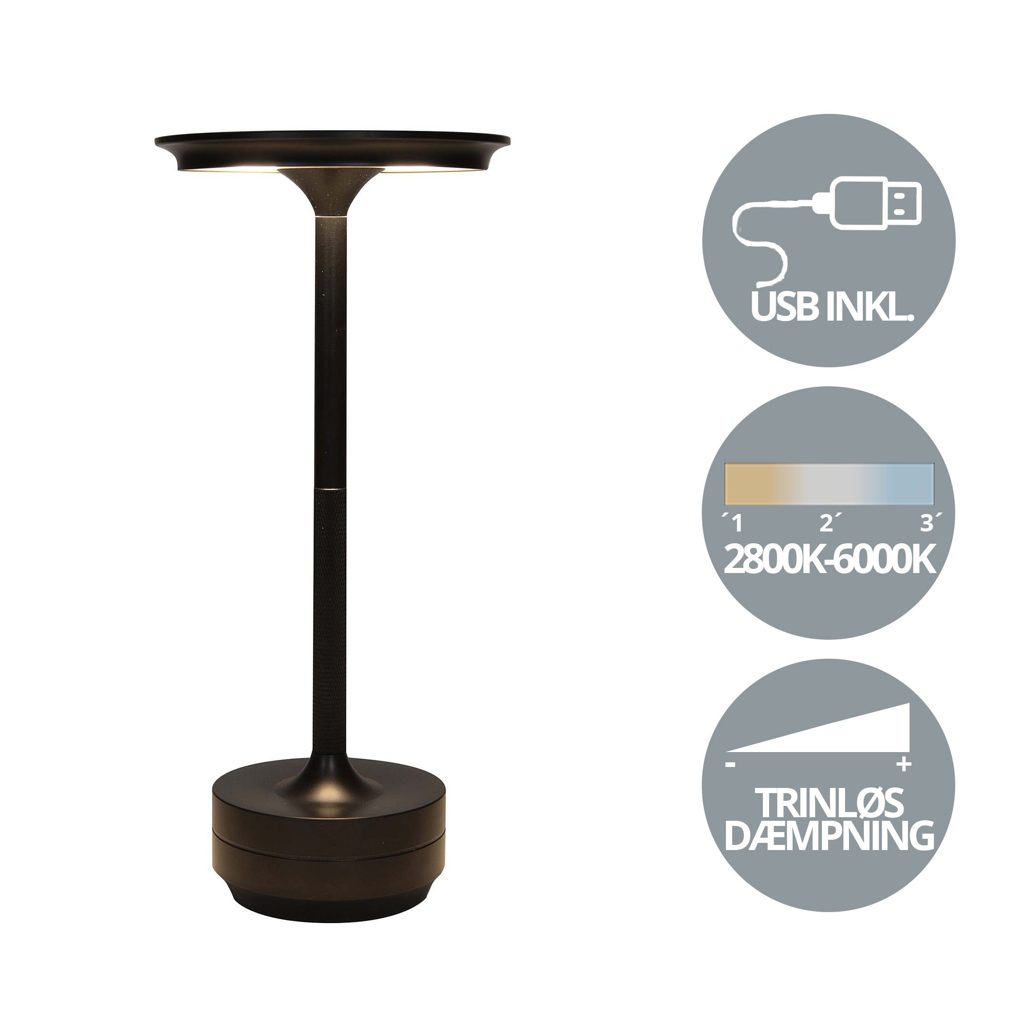Genopladelig bordlampe med kelvin-skift, trinløst dæmpning, 28 cm høj, i matsort farve - IP44 CB218640  Genopladelig bordlampe med kelvin-skift, trinløst dæmpning, 28 cm høj, i matsort farve - IP44 CB218640